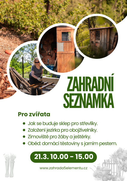 Společně postavíme plot, založíme vyvýšený záhon typu německá kopa či vybudujeme jezírko pro obojživelníky. Kdo chce klidnější práci, může se věnovat semínkovně. Seznámíte se s principy přírodního zahradničení v praxi a ochutnáte lokální jídlo bez chemie.
